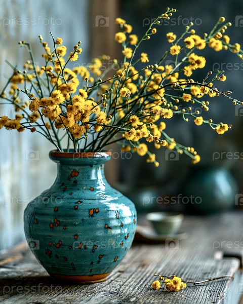 На деревянном столе стоит ваза из голубой глины с букетом цветов мимозы