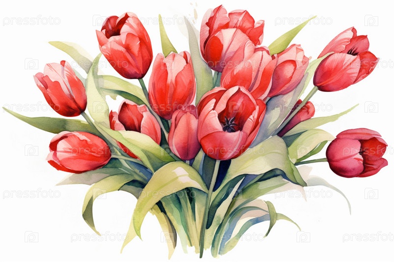 Крупный план букета красных тюльпанов в акварельном стиле на белом фоне