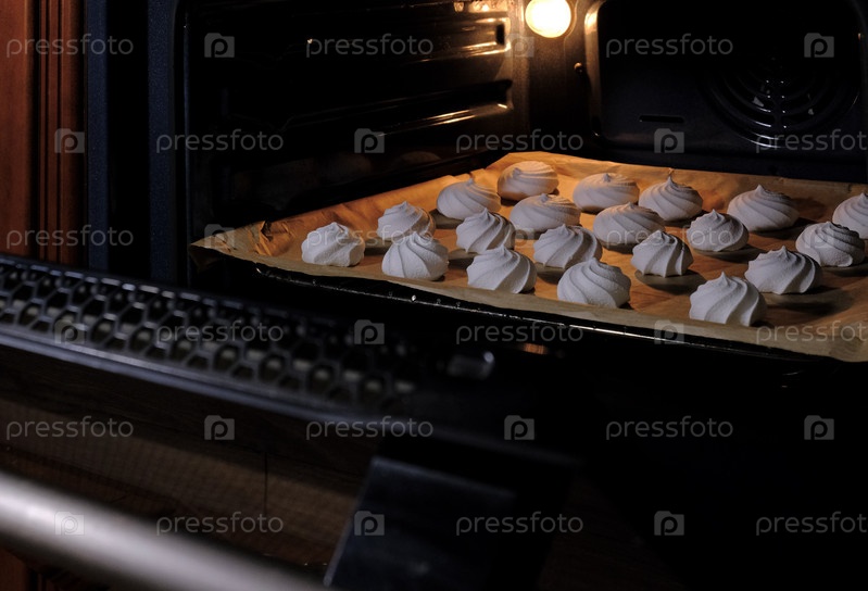 На кухне белые безе готовятся на противне в духовке
