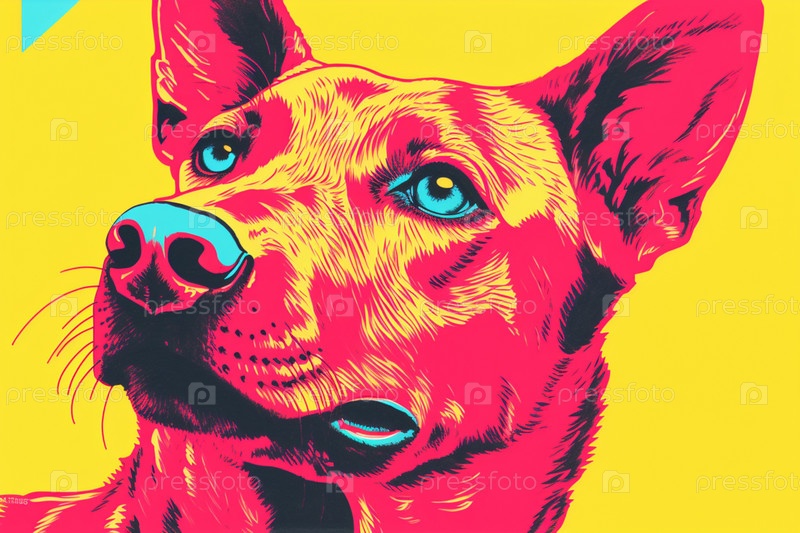 Красная собака крупным планом на желтом фоне в стиле ризографа, винтаж, мягкий фокус