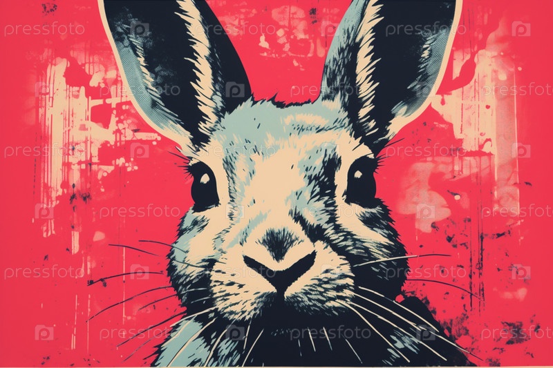 Крупный план лица черного кролика, смотрящего в камеру на красном фоне в стиле ризографа, винтажный, мягкий фокус