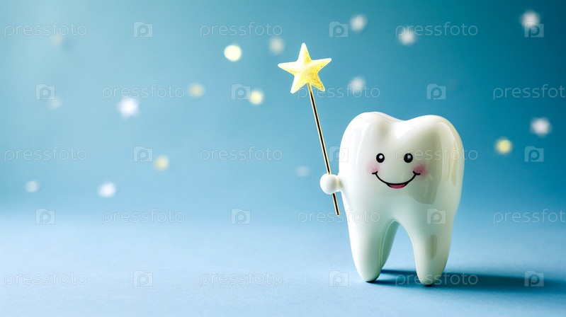 Улыбающийся белый счастливый зуб на синем фоне с волшебной палочкой в руке