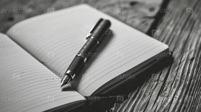 На деревянном столе лежит открытая тетрадь без заметок и чернильная ручка, фотография в стиле минимализма и монохрома на день писателя