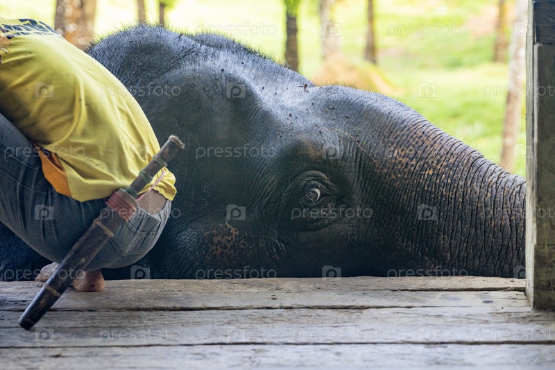Таиланд.Као-Лак.Погонщик садится на слона перед прогулкой.Таиланд.Као-Лак.Махут сидит на слоне перед прогулкой