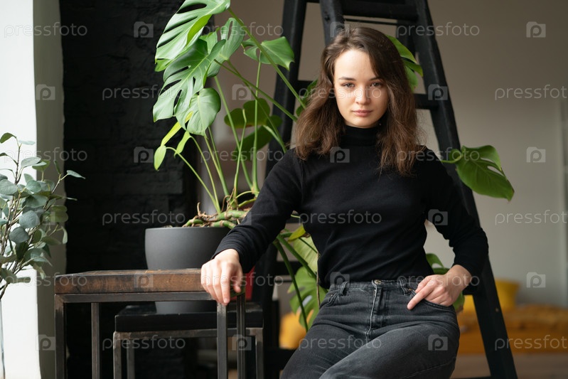 Молодая красивая женщина позирует в студии в черном свитере возле окна