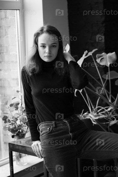 Молодая красивая женщина позирует в студии в черном свитере возле окна