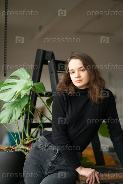 Молодая красивая женщина позирует в студии в черном свитере возле окна