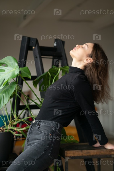 Молодая красивая женщина позирует в студии в черном свитере возле окна