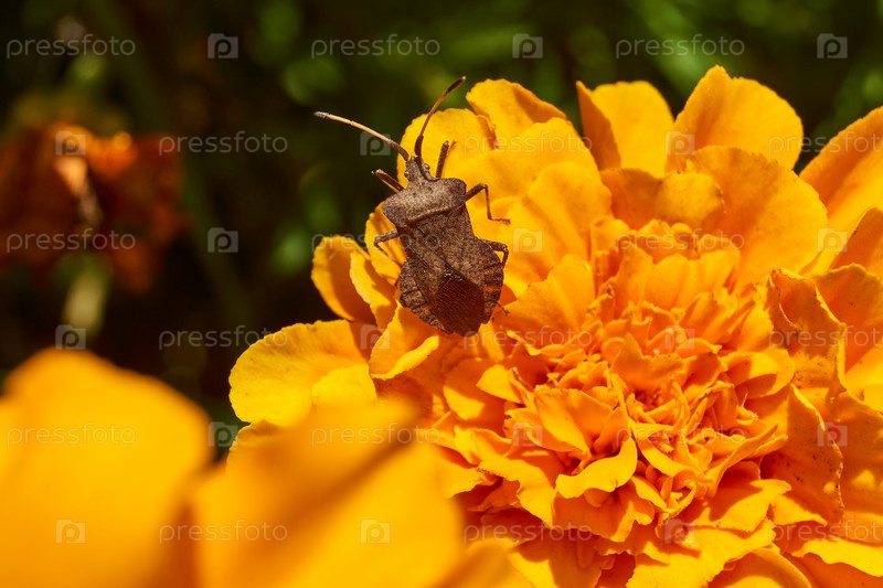 Постельный жук Coreus Marginatus ползает по цветам бархатников.Coreus Marginatus травоядный вид настоящих жуков семейства Coreidae