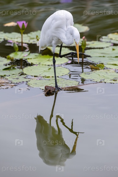 Таиланд.Као-Лак.Белая цапля на поверхности пруда.Таиланд.Као-Лак.Белый гребешок на поверхности пруда