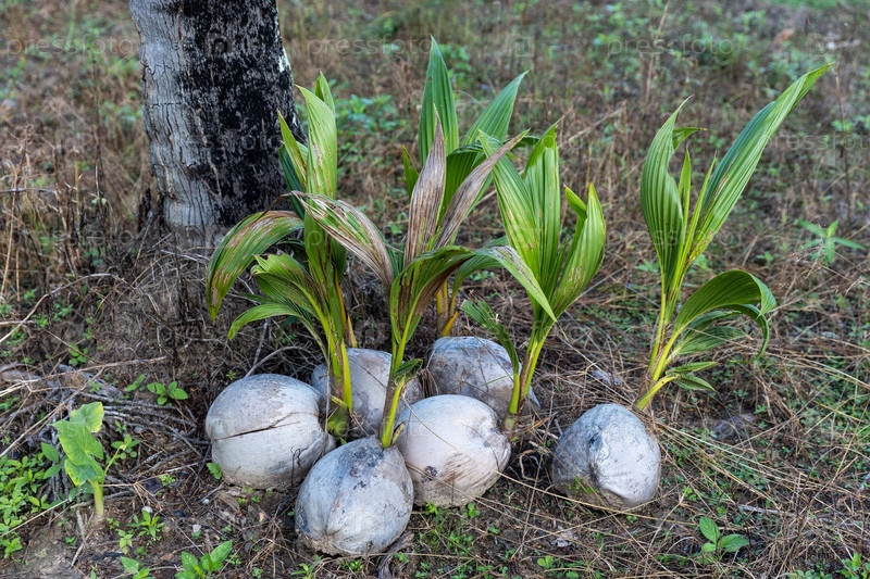 Таиланд.Као-Лак.Выросшие кокосовые орехи на земле.Таиланд.Као-Лак.Прорастающие кокосовые орехи на земле
