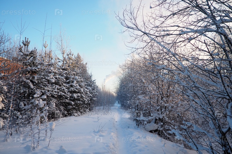 Сосновый лес зимой днем при сильных морозах, Карелия. Снег на хвойных ветвях. Морозный солнечный антициклон. Сосна обыкновенная Pinus sylvestris сосновое растение Pinus из Pine Pinaceae