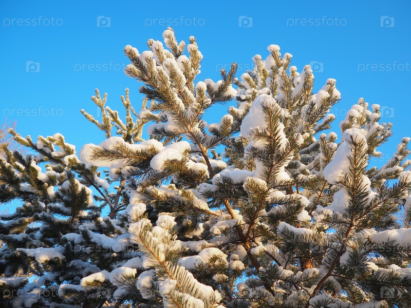 Сосновый лес зимой днем при сильных морозах, Карелия. Снег на хвойных ветвях. Морозный солнечный антициклон. Сосна обыкновенная Pinus sylvestris сосновое растение Pinus из Pine Pinaceae