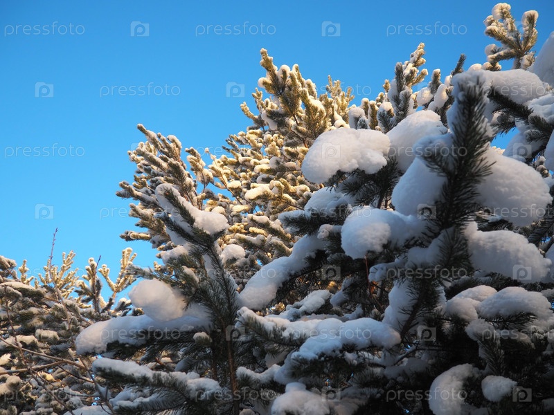 Сосновый лес зимой днем при сильных морозах, Карелия. Снег на хвойных ветвях. Морозный солнечный антициклон. Сосна обыкновенная Pinus sylvestris сосновое растение Pinus из Pine Pinaceae