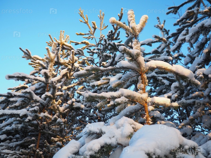 Сосновый лес зимой днем при сильных морозах, Карелия. Снег на хвойных ветвях. Морозный солнечный антициклон. Сосна обыкновенная Pinus sylvestris сосновое растение Pinus из Pine Pinaceae