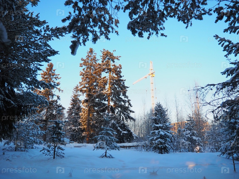 Создание нового объекта недвижимости в безлюдном месте, вдали от центра города. Сосновый зимний лес. Подъемный строительный кран на фоне голубого неба. Нападение города на лес и природу. Экология