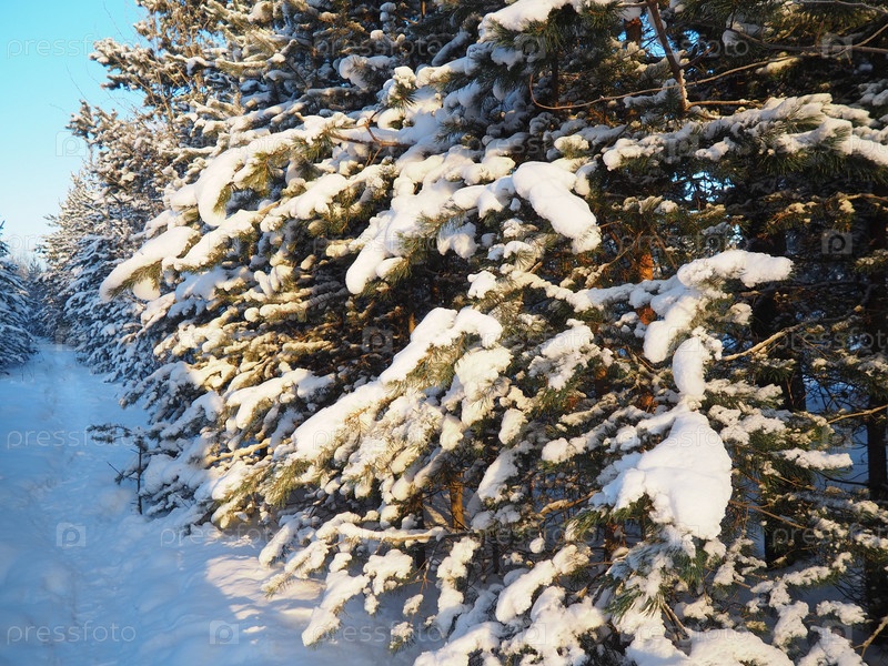 Сосновый лес зимой днем при сильных морозах, Карелия. Снег на хвойных ветвях. Морозный солнечный антициклон. Сосна обыкновенная Pinus sylvestris сосновое растение Pinus из Pine Pinaceae