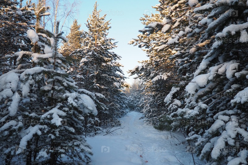 Сосновый лес зимой днем при сильных морозах, Карелия. Снег на хвойных ветвях. Морозный солнечный антициклон. Сосна обыкновенная Pinus sylvestris сосновое растение Pinus из Pine Pinaceae
