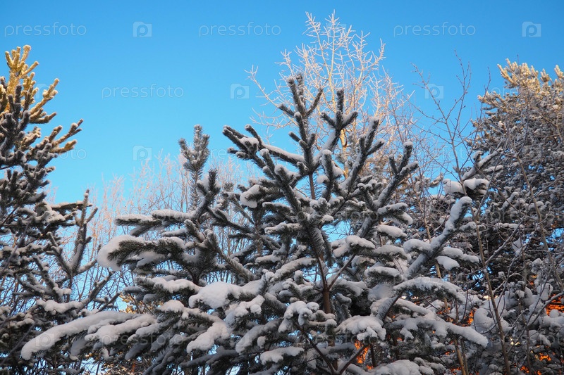 Сосновый лес зимой днем при сильных морозах, Карелия. Снег на хвойных ветвях. Морозный солнечный антициклон. Сосна обыкновенная Pinus sylvestris сосновое растение Pinus из Pine Pinaceae