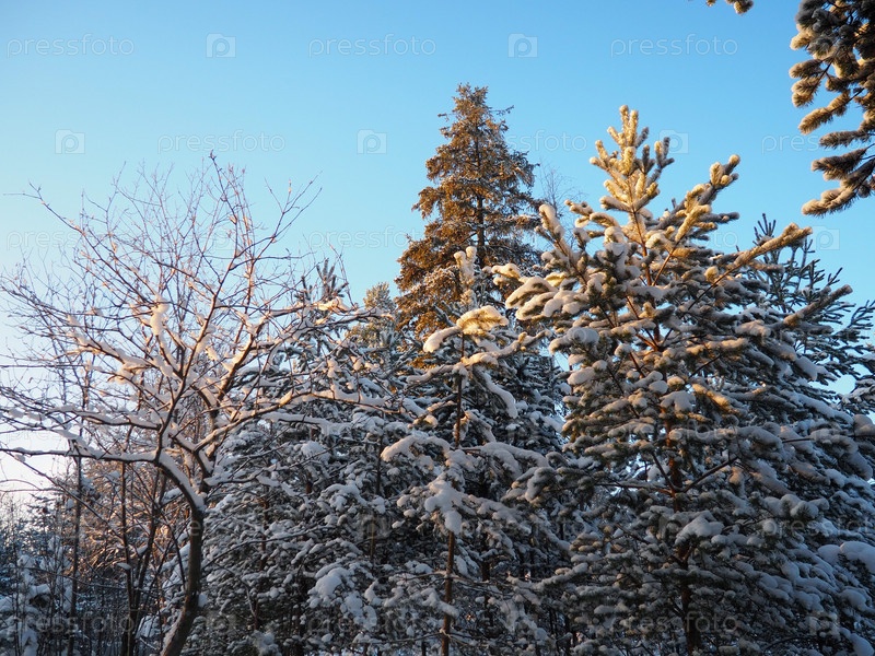 Сосновый лес зимой днем при сильных морозах, Карелия. Снег на хвойных ветвях. Морозный солнечный антициклон. Сосна обыкновенная Pinus sylvestris сосновое растение Pinus из Pine Pinaceae