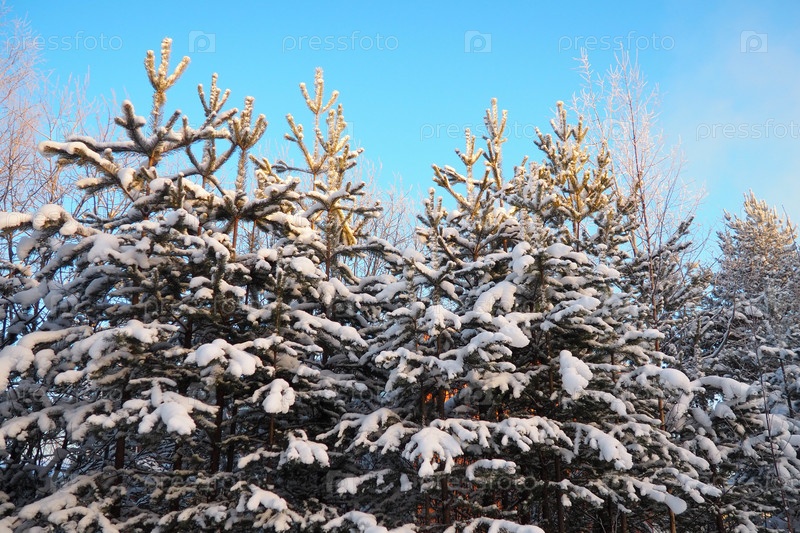 Сосновый лес зимой днем при сильных морозах, Карелия. Снег на хвойных ветвях. Морозный солнечный антициклон. Сосна обыкновенная Pinus sylvestris сосновое растение Pinus из Pine Pinaceae
