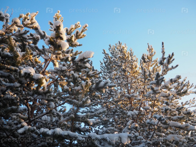 Сосновый лес зимой днем при сильных морозах, Карелия. Снег на хвойных ветвях. Морозный солнечный антициклон. Сосна обыкновенная Pinus sylvestris сосновое растение Pinus из Pine Pinaceae