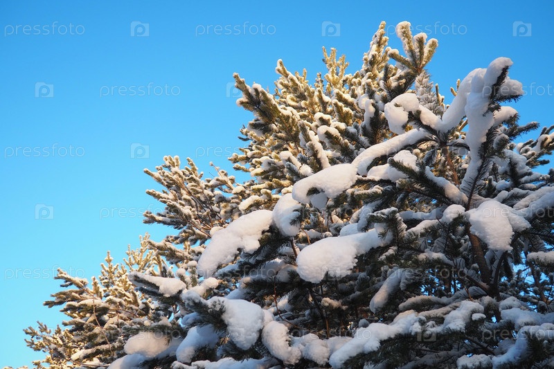 Сосновый лес зимой днем при сильных морозах, Карелия. Снег на хвойных ветвях. Морозный солнечный антициклон. Сосна обыкновенная Pinus sylvestris сосновое растение Pinus из Pine Pinaceae