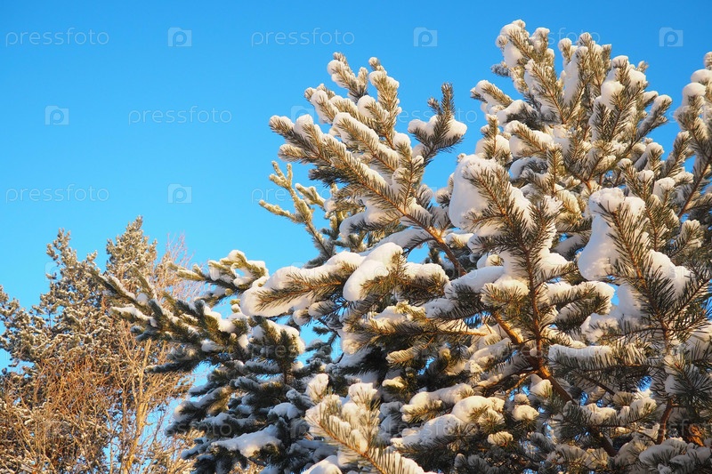 Сосновый лес зимой днем при сильных морозах, Карелия. Снег на хвойных ветвях. Морозный солнечный антициклон. Сосна обыкновенная Pinus sylvestris сосновое растение Pinus из Pine Pinaceae