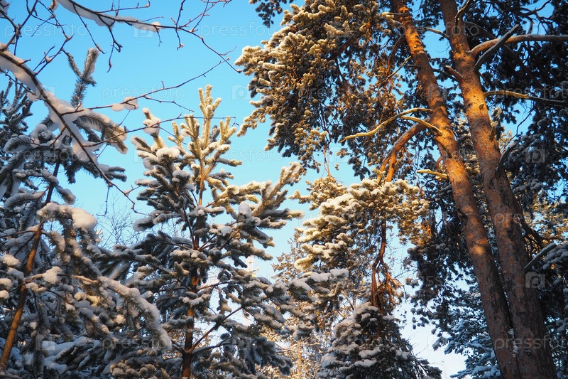 Сосновый лес зимой днем при сильных морозах, Карелия. Снег на хвойных ветвях. Морозный солнечный антициклон. Сосна обыкновенная Pinus sylvestris сосновое растение Pinus из Pine Pinaceae