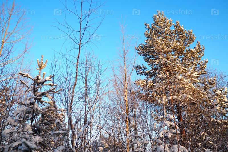 Сосновый лес зимой днем при сильных морозах, Карелия. Снег на хвойных ветвях. Морозный солнечный антициклон. Сосна обыкновенная Pinus sylvestris сосновое растение Pinus из Pine Pinaceae