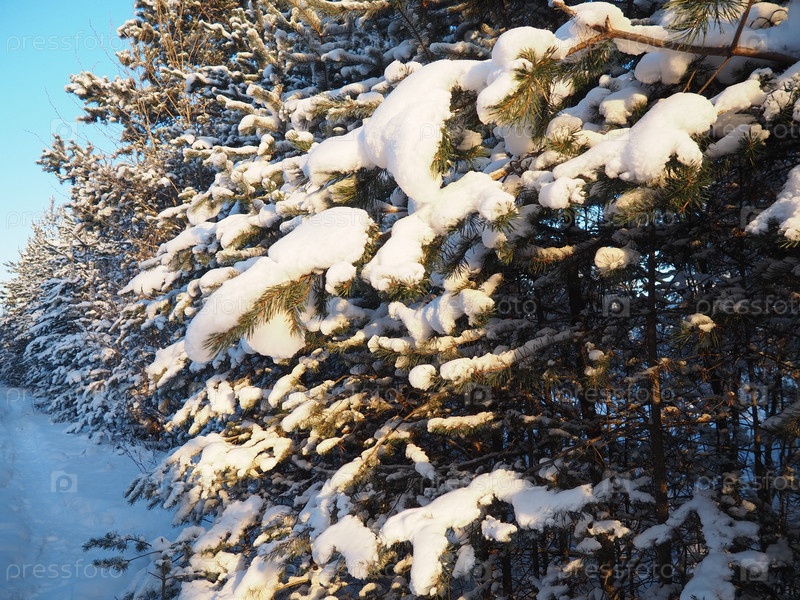 Сосновый лес зимой днем при сильных морозах, Карелия. Снег на хвойных ветвях. Морозный солнечный антициклон. Сосна обыкновенная Pinus sylvestris сосновое растение Pinus из Pine Pinaceae