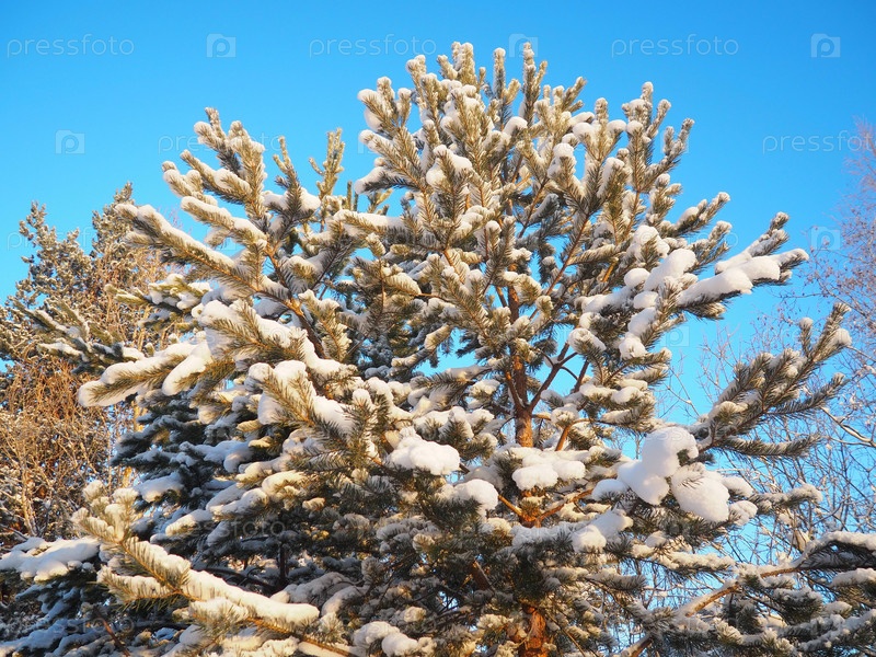 Сосновый лес зимой днем при сильных морозах, Карелия. Снег на хвойных ветвях. Морозный солнечный антициклон. Сосна обыкновенная Pinus sylvestris сосновое растение Pinus из Pine Pinaceae