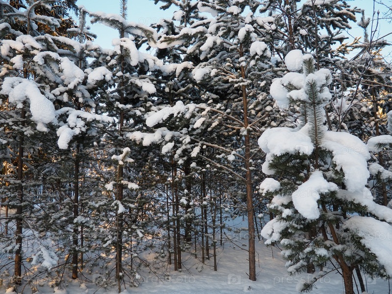 Сосновый лес зимой днем при сильных морозах, Карелия. Снег на хвойных ветвях. Морозный солнечный антициклон. Сосна обыкновенная Pinus sylvestris сосновое растение Pinus из Pine Pinaceae
