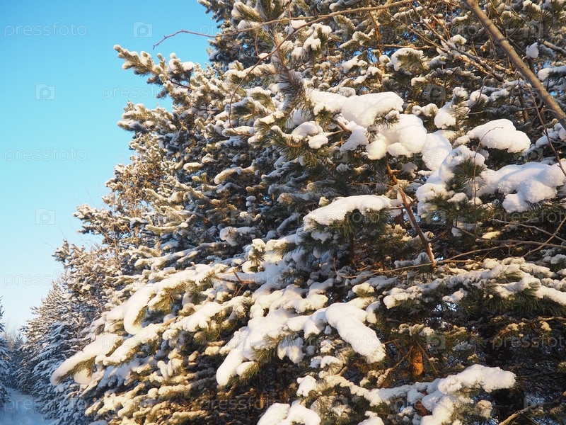 Сосновый лес зимой днем при сильных морозах, Карелия. Снег на хвойных ветвях. Морозный солнечный антициклон. Сосна обыкновенная Pinus sylvestris сосновое растение Pinus из Pine Pinaceae