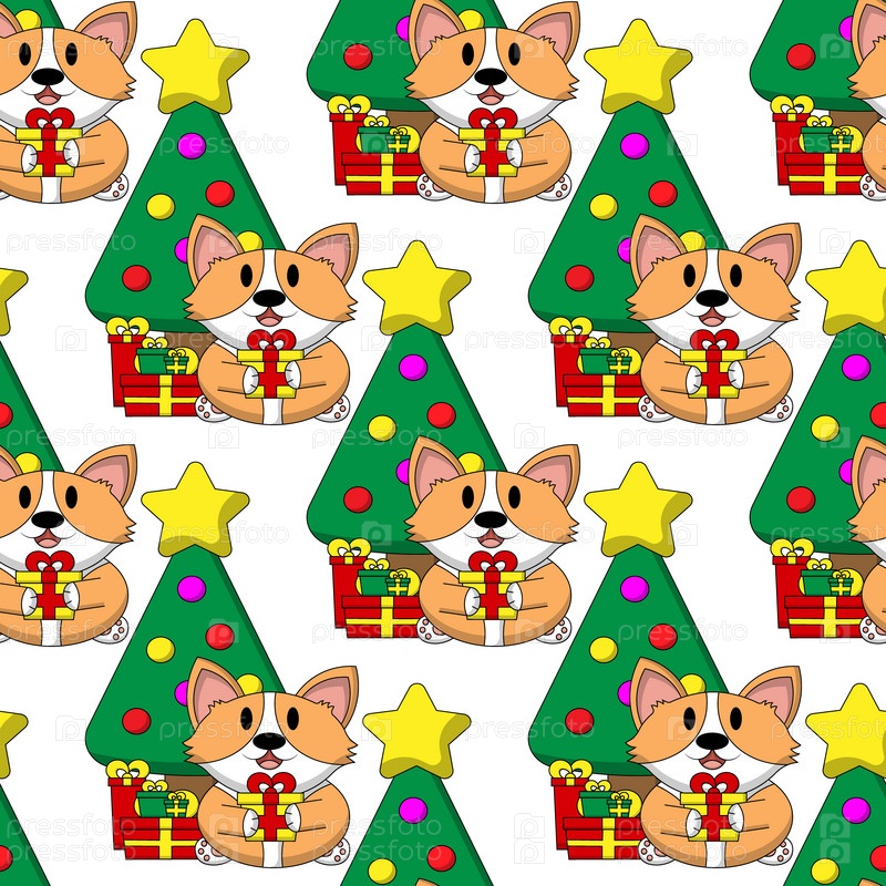 Бесшовный рисунок с милым корги с рождественской елкой