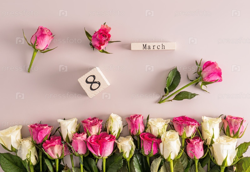 Красивый праздничный фон к Международному женскому дню восьмого марта с нежными белыми и розовыми розами и деревянным календарем. граница