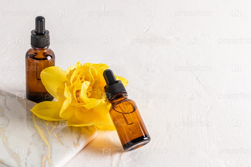 Роскошные косметические флаконы с натуральным органическим продуктом или сывороткой для ухода за молодой кожей. белый фон. Передний план. Красивый желтый цветок