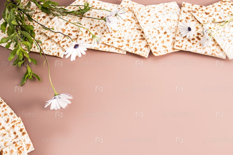 Праздничный фон для еврейского праздника Пасхи. Традиционный ретуал-маца и белые нежные весенние цветы. Копировальное пространство. рамка