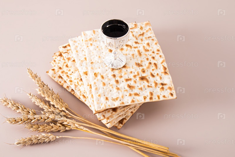 Серебряный бокал красного вина стоит на стопке ломтиков мацы на бежевом фоне с колосьями кукурузы. Концепция еврейского праздника Пасхи
