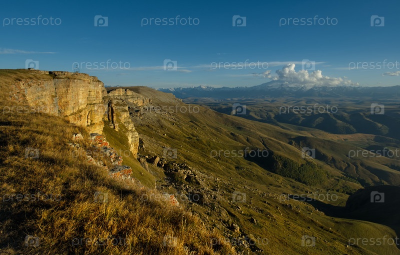 Россия, Приэльбрусье. Потрясающий вечерний вид на заснеженную гору Эльбрус с обрыва плато Большой Бермамыт