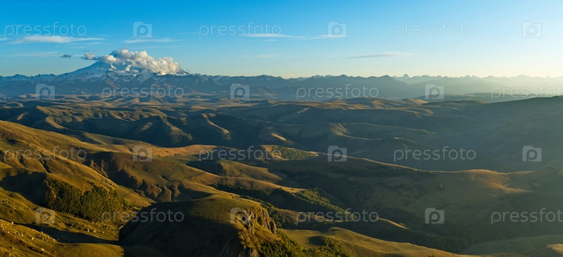 Россия, Приэльбрусье. Потрясающий вечерний вид на заснеженную гору Эльбрус с обрыва плато Большой Бермамыт