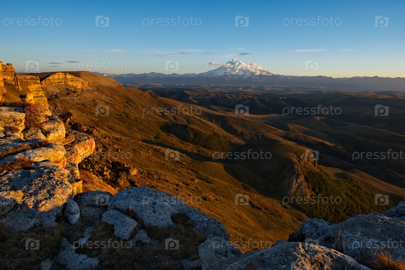 Россия, Приэльбрусье. Потрясающий вечерний вид на заснеженную гору Эльбрус с обрыва плато Большой Бермамыт