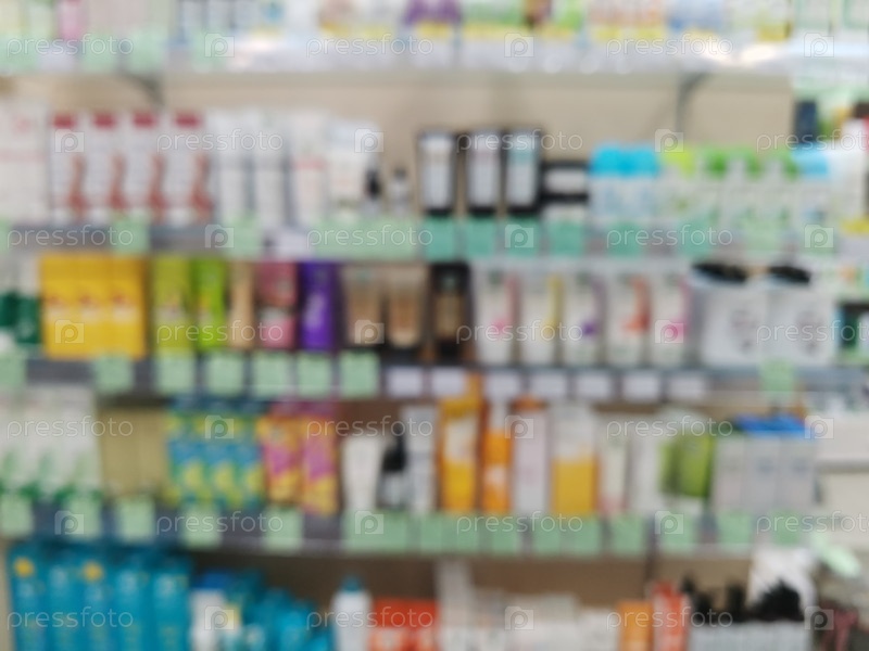 Размытый фон с полками со средствами по уходу за кожей и волосами в косметическом магазине