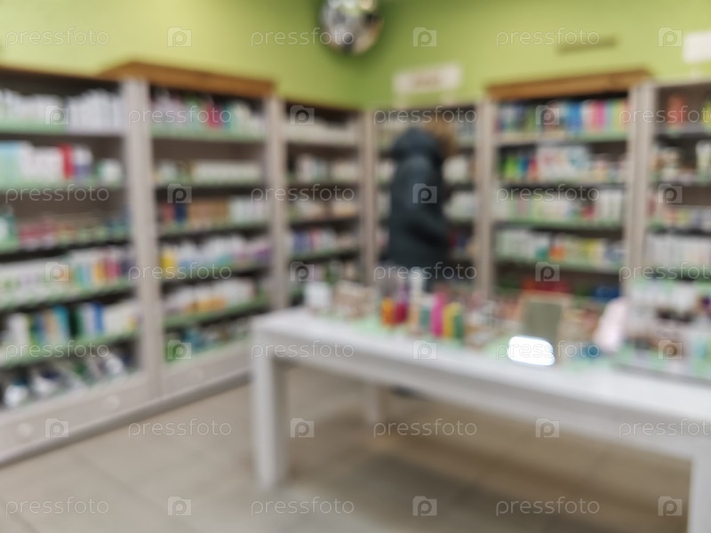 Размытый фон с полками со средствами по уходу за кожей и волосами в косметическом магазине