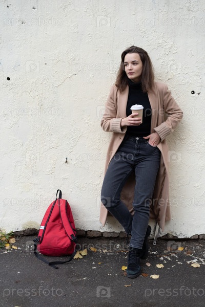 Молодая красивая женщина позирует в пальто на улице, стоит с кофе возле белой стены