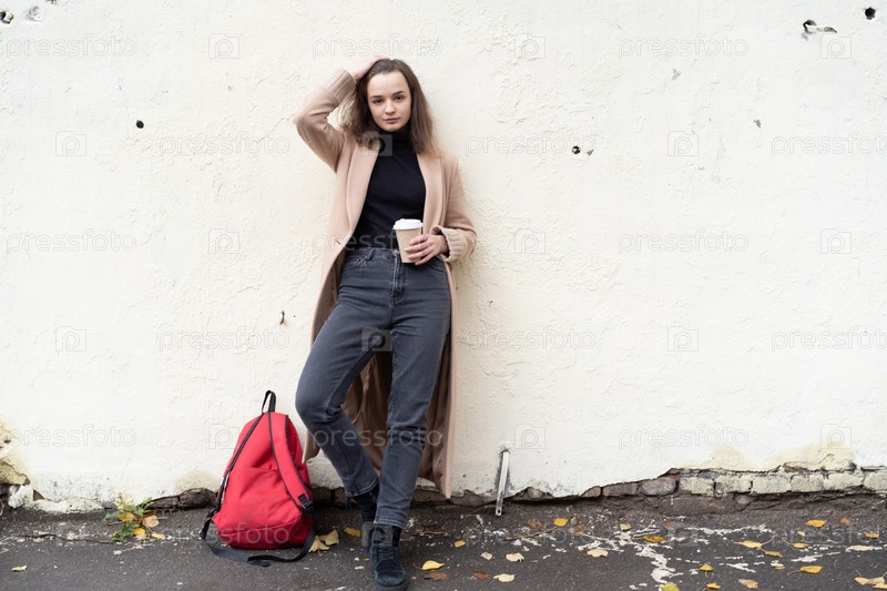 Молодая красивая женщина позирует в пальто на улице, стоит с кофе возле белой стены
