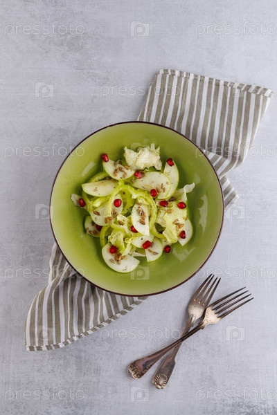 Зеленый салат со свежими овощами и фруктами. Салат из зеленого яблока и зеленого перца с зернами граната в зеленой тарелке