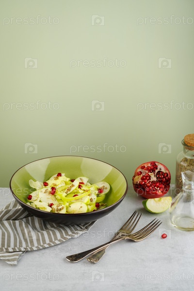 Зеленый салат со свежими овощами и фруктами. Салат из зеленого яблока и зеленого перца с зернами граната в зеленой тарелке