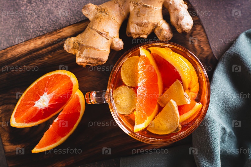 Крупным планом ароматный чай с кусочками апельсина и имбиря в чашке на столе