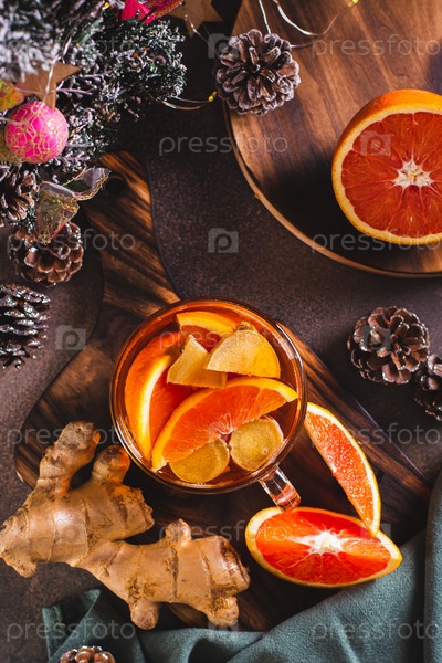 Вкусный домашний чай с апельсином и имбирем в стеклянной кружке на столе и вертикальном виде